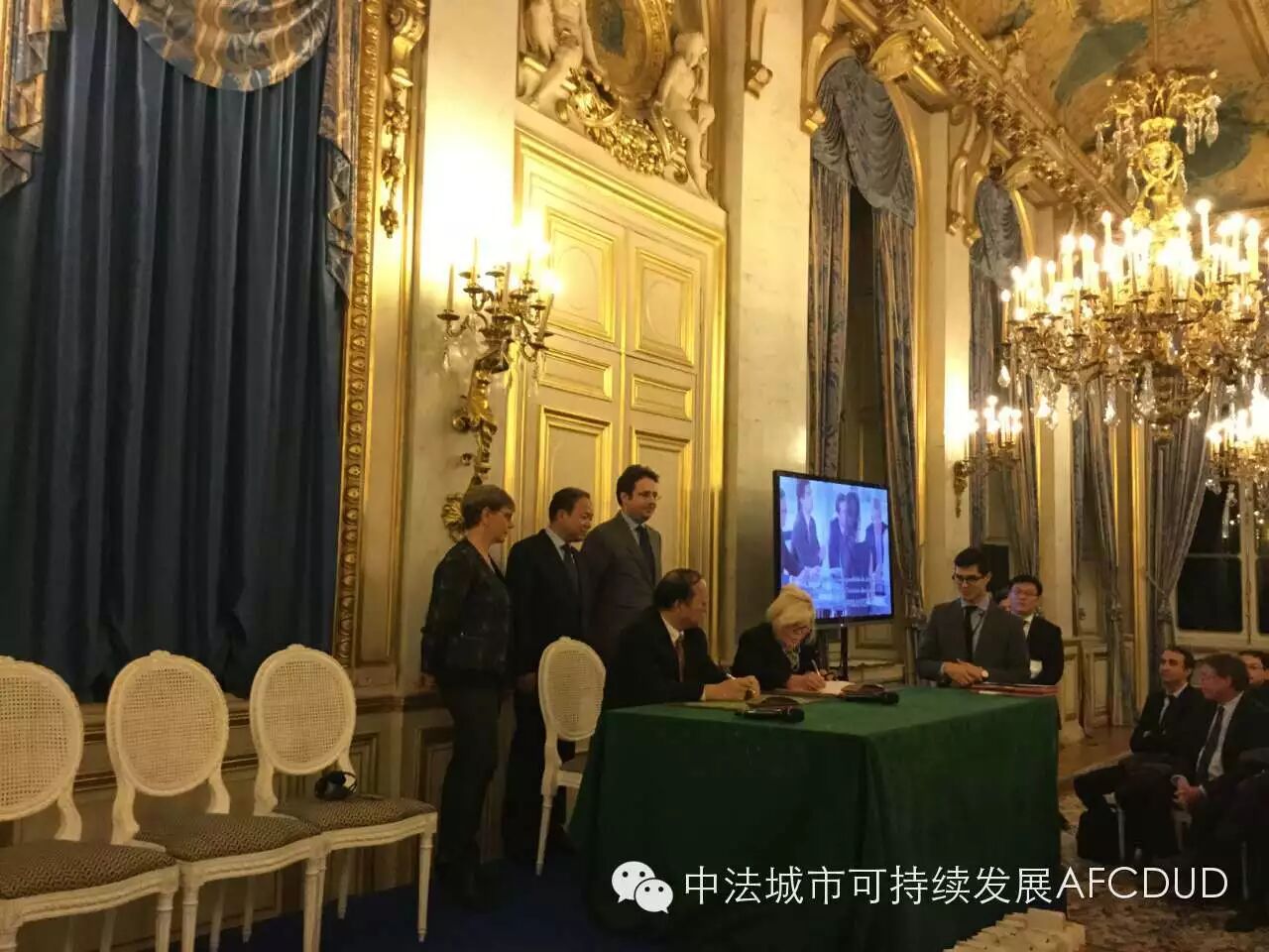 法国外交部装修金碧辉煌,保留了法国古典特色;同时,内部展示着不少法国顶尖科技产品,真正做到了古典与现代结合。在这样宜人的环境中,协会推荐的两家企业——Nanomade与LAM分别与蔡甸中法生态示范城管委会签署合作协议。法国外交与国际发展部外贸国务秘书费克尔先生、武汉市长万勇先生、Vivapolis方联系人帕帕拉朵女士、蔡甸区书记刘子清分别致辞。
