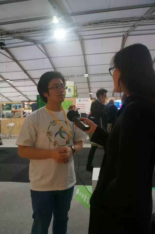 16:40,欧洲华语中文电台记者王呢喃采访了秘书长陈俊龙,谈到这次筹备过程,全程倾心参与的他非常激动。他表示,展台的全部搭建都是由志愿者纯手工制作,可谓是“白手起家”,这一代青年人的情怀和梦想就融在这展台的每一个角落。虽然民间组织很少能影响高层的决策,但是更重要的是值此契机,和各地的有志青年沟通交流,并向全世界展现中国年轻人的担当。对于气候大会的结果,秘书长表示,上一次根本哈根气候大会的失败在于缺乏实施方案,只有将政策技术和金融结合起来,才能真正实现目标。王呢喃记者在采访过后表示,她也参观了其他协会的展台,但是都比较官方,感觉我们的展台最有活力,参会体会最真实。
